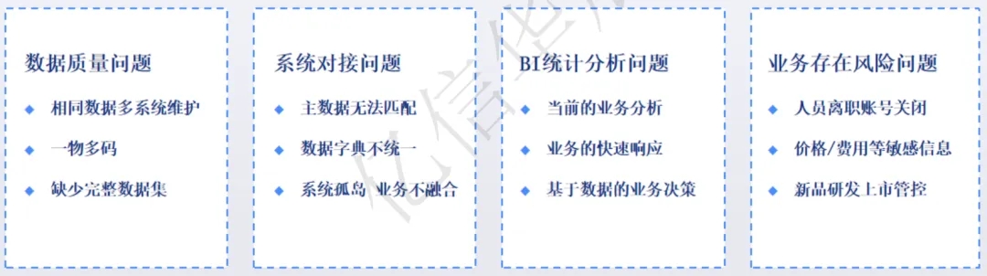 四是營收規(guī)模與數(shù)字投入的巨大差異,從小至不足2億的小產(chǎn)業(yè)到數(shù)百億量級的大產(chǎn)業(yè),均需在統(tǒng)一框架下實現(xiàn)主數(shù)據(jù)的有效管理。