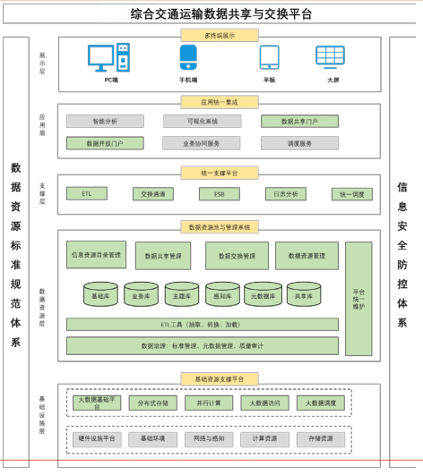 根據省級工程指南指導和某自治區交通運輸行業的實際需求,對某自治區交通運輸數據共享交換與開放平臺整體框架規劃設計,主要包含了基礎設施、數據資源、支撐平臺、應用、展示5層框架。如圖所示,其中綠色部分為項目建設內容。