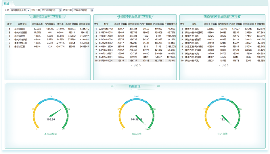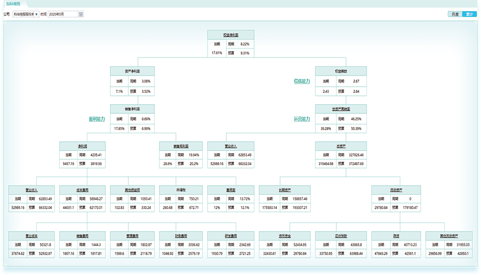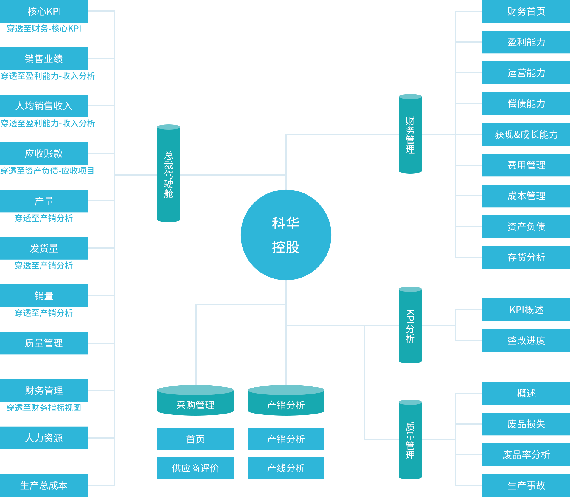 (3)提升企業數據資產效能:通過數據分析確定經營成果需改進的方向,通過過程數據的采集監控改進結果;通過指標體系傳導經營理念和重點,推進管理和業績提升;通過數據補錄系統和信息化數據的轉換,完善數據源,加強過程監控,實現數據資產價值。科華控股數據分析系統,是基于公司財務、人力、供應鏈、質量、生產等各模塊系統數據,對數據進行加工計算,展現于網頁之上,用于幫助使用者分析公司歷史及現狀,對未來決策提供分析依據。