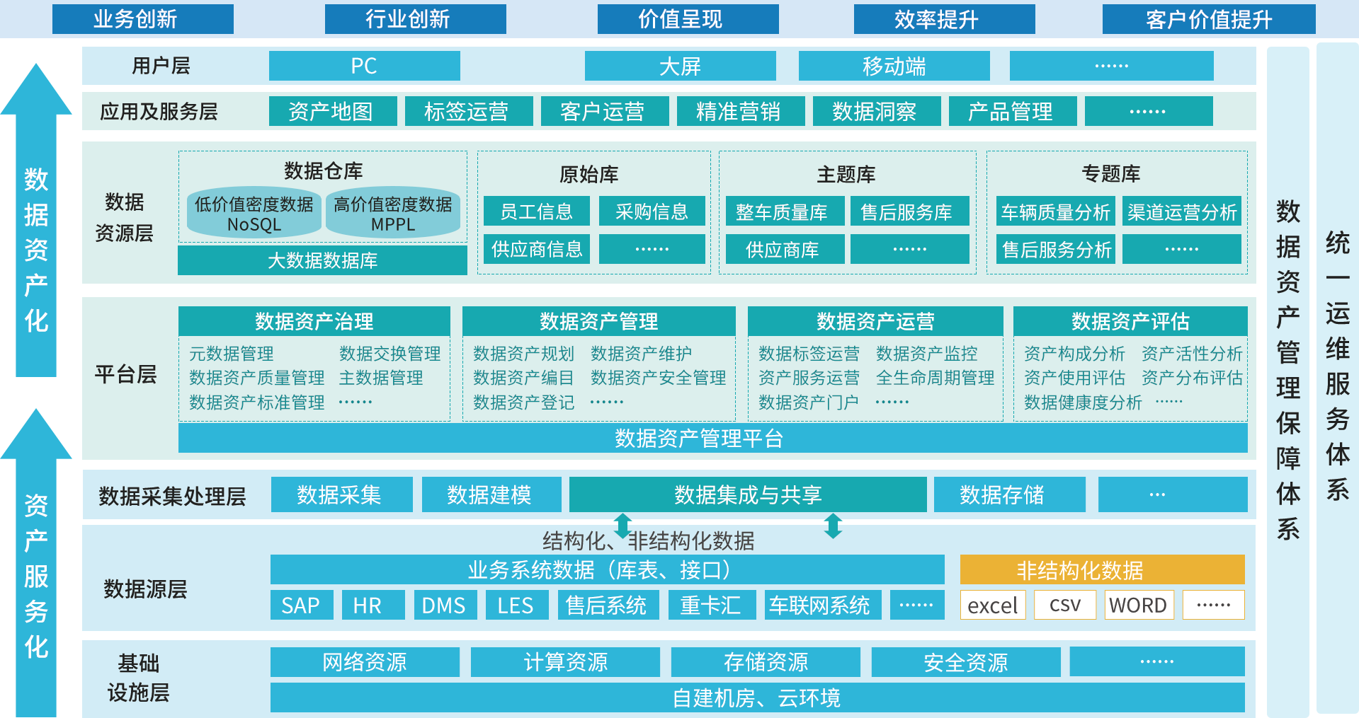 項(xiàng)目整體以“1平臺(tái)+2體系”為建設(shè)方針,通過(guò)整合公司內(nèi)外部數(shù)據(jù)資源,打通各領(lǐng)域數(shù)據(jù),統(tǒng)一數(shù)據(jù)資源采集和數(shù)據(jù)資產(chǎn)建模,保障數(shù)據(jù)資產(chǎn)安全,強(qiáng)化對(duì)數(shù)據(jù)資產(chǎn)的運(yùn)營(yíng)和管理。實(shí)現(xiàn)公司業(yè)務(wù)數(shù)據(jù)化、數(shù)據(jù)資產(chǎn)化、資產(chǎn)服務(wù)化、服務(wù)業(yè)務(wù)化的目標(biāo),推動(dòng)公司數(shù)字化轉(zhuǎn)型,驅(qū)動(dòng)公司的業(yè)務(wù)創(chuàng)新、數(shù)據(jù)資產(chǎn)價(jià)值呈現(xiàn)、管理和運(yùn)營(yíng)效率提升。