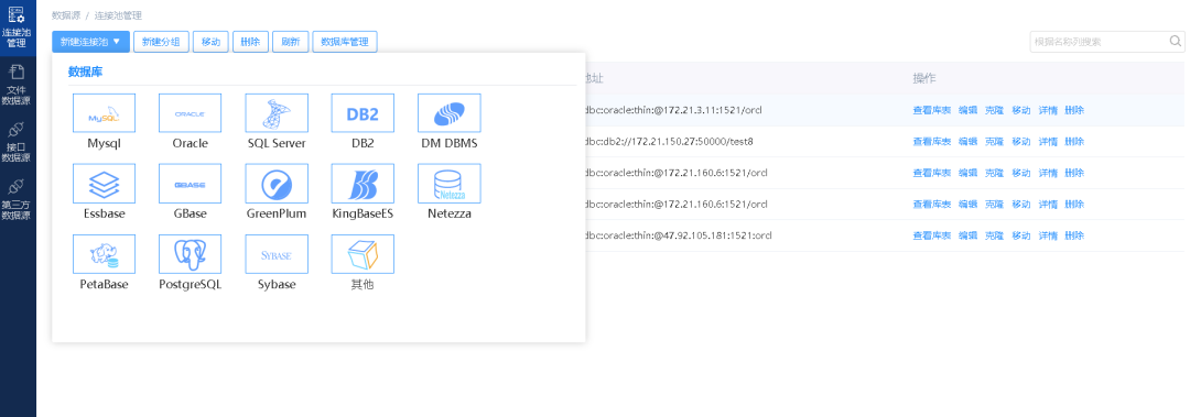 i@Report5.3提供了豐富的數據庫類型接入,包括主流的關系型數據庫以及分布式數據庫,能將業務系統數據對接到平臺中,提供后續建模分析使用。數據庫類型包括:Mysql、Oracle、SQL Server、DB2、GBase、PetaBase、Essbase等,同時也支持通過接入其他數據庫驅動的方式自定義數據庫。