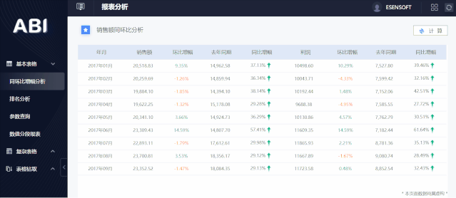 報表分析:包括同環比增幅分析、排名分析、參數查詢等基本表格,還有中國式復雜報表、簡歷報表、聚合函數的等復雜表格,同時支持維度鉆取、嵌入式等多種鉆取方式。