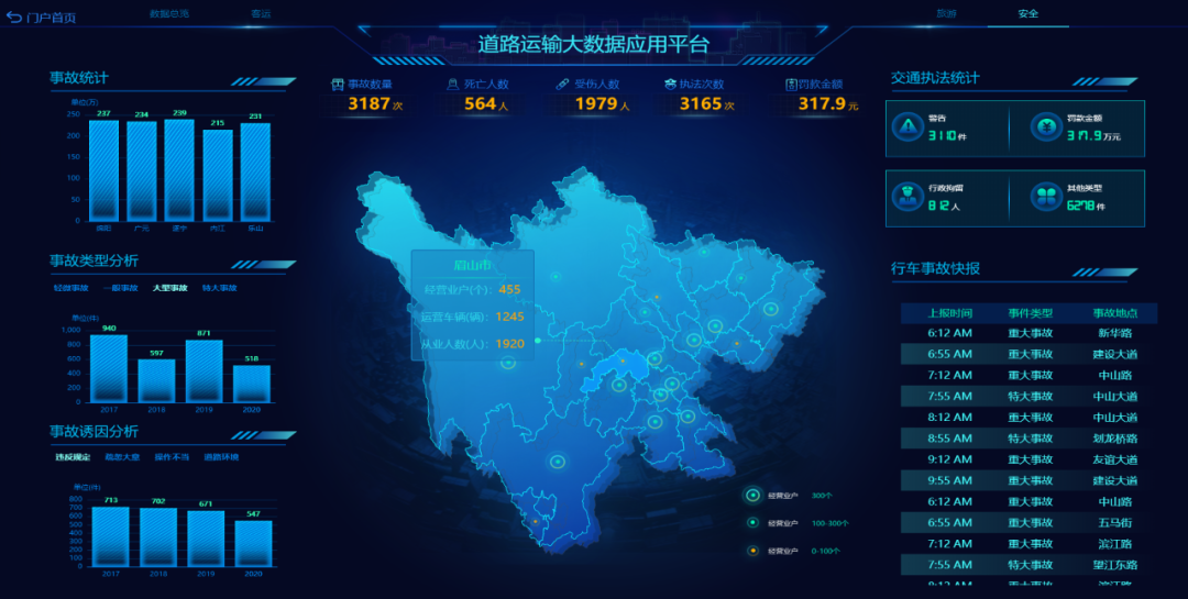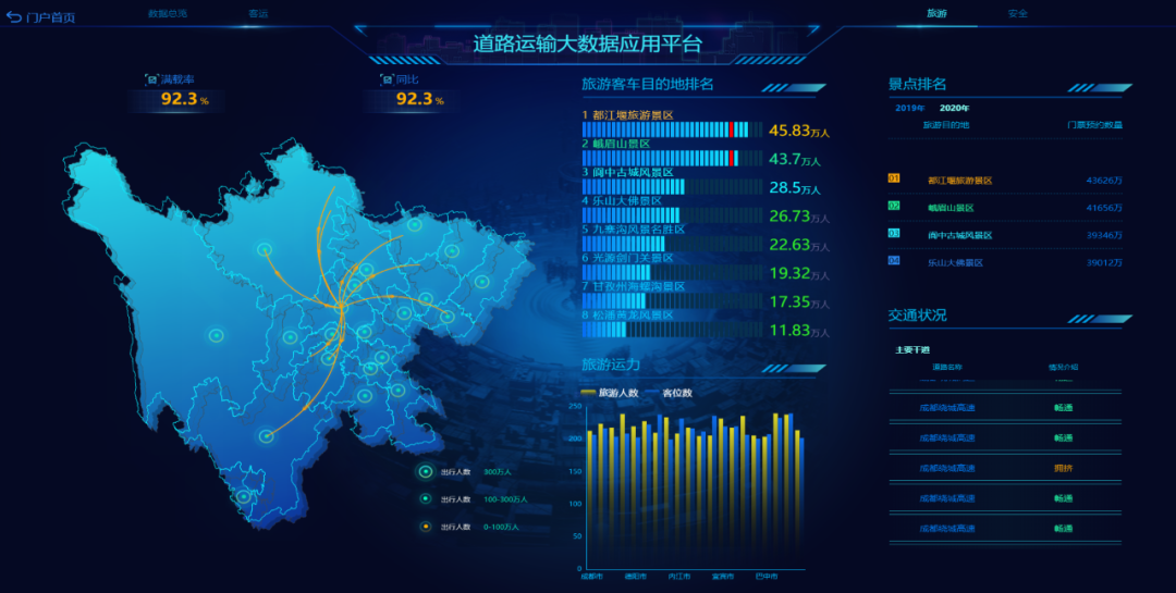 對(duì)于交通管理部門來說,利用可視化大屏能為交通管理指揮提供科學(xué)的決策支持。由于大屏集成地理信息系統(tǒng)、視頻監(jiān)控系統(tǒng)、交管部門各業(yè)務(wù)系統(tǒng)數(shù)據(jù),對(duì)交通路況、警力分布、警情事件、接處警情況等要素進(jìn)行綜合監(jiān)測(cè),能夠幫助管理者實(shí)時(shí)掌握交通整體運(yùn)行態(tài)勢(shì)。