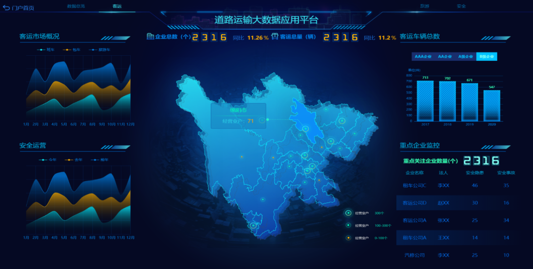 大數(shù)據(jù)可視化系統(tǒng),支持整合城市各部門現(xiàn)有信息系統(tǒng)的數(shù)據(jù)資源,覆蓋各業(yè)務(wù)領(lǐng)域,實(shí)現(xiàn)城市運(yùn)行態(tài)勢(shì)監(jiān)測(cè)、建設(shè)規(guī)劃成果展示、應(yīng)急監(jiān)測(cè)指揮支持等多種功能,可廣泛應(yīng)用于監(jiān)測(cè)指揮、分析研判、展示匯報(bào)等場(chǎng)景。