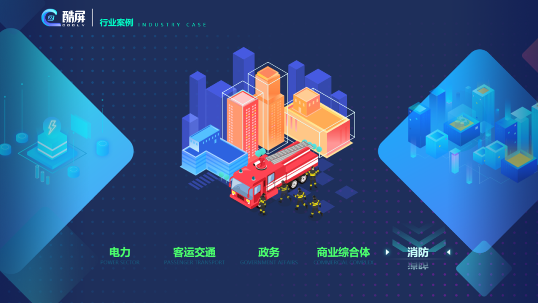 此DEMO囊括政務(wù)、電力、交通、商業(yè)、消防五大行業(yè)案例,點(diǎn)擊行業(yè)可切換不同行業(yè)。