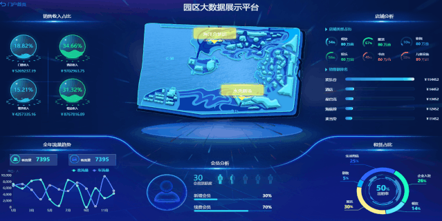 商業(yè)綜合體大數(shù)據(jù)展示平臺(tái)可高度融合園區(qū)各領(lǐng)域現(xiàn)有數(shù)據(jù)資源,對(duì)園區(qū)產(chǎn)業(yè)、招商、安防、資產(chǎn)、基礎(chǔ)設(shè)施、能效、環(huán)境空間等管理領(lǐng)域的關(guān)鍵指標(biāo)進(jìn)行綜合監(jiān)測(cè)分析,輔助管理者全面掌控園區(qū)運(yùn)行態(tài)勢(shì),實(shí)現(xiàn)園區(qū)人、事、物統(tǒng)一管理,園區(qū)綜合運(yùn)營(yíng)態(tài)勢(shì)一屏掌握。