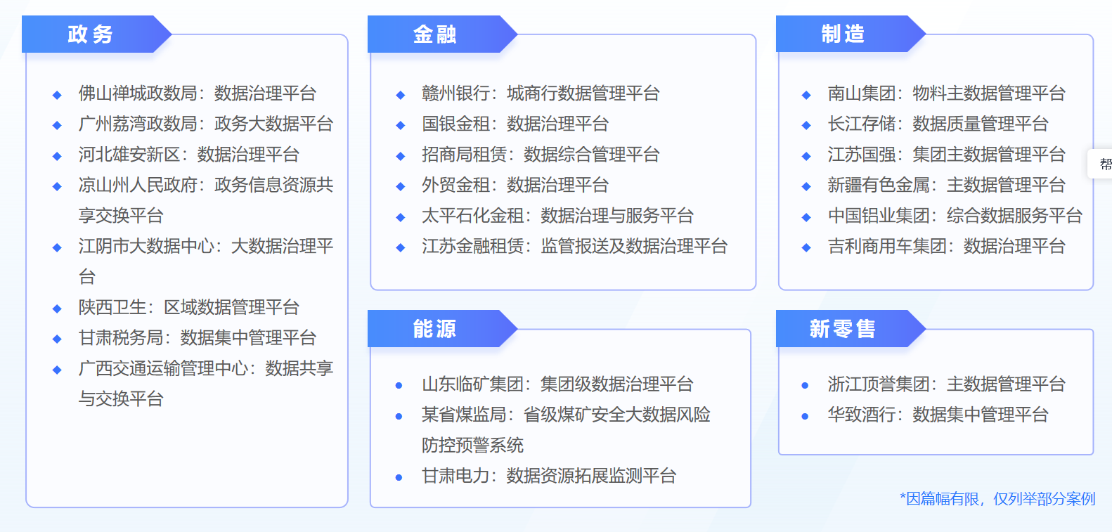 商業(yè)智能方案等多套數(shù)據(jù)治理方案,涵蓋數(shù)據(jù)中臺(tái)、數(shù)據(jù)資產(chǎn)、