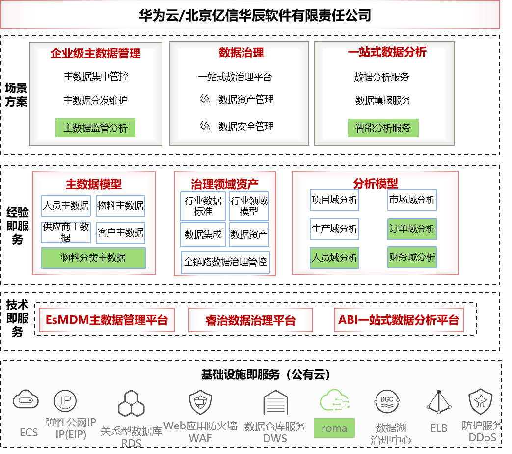數(shù)據(jù)倉(cāng)庫(kù)DWS+ROMA Connect+主數(shù)據(jù)管理平臺(tái)+一站式數(shù)據(jù)分析平臺(tái)組成的數(shù)據(jù)中臺(tái)解決方案,通過DataArts Studio/睿治開展全鏈路