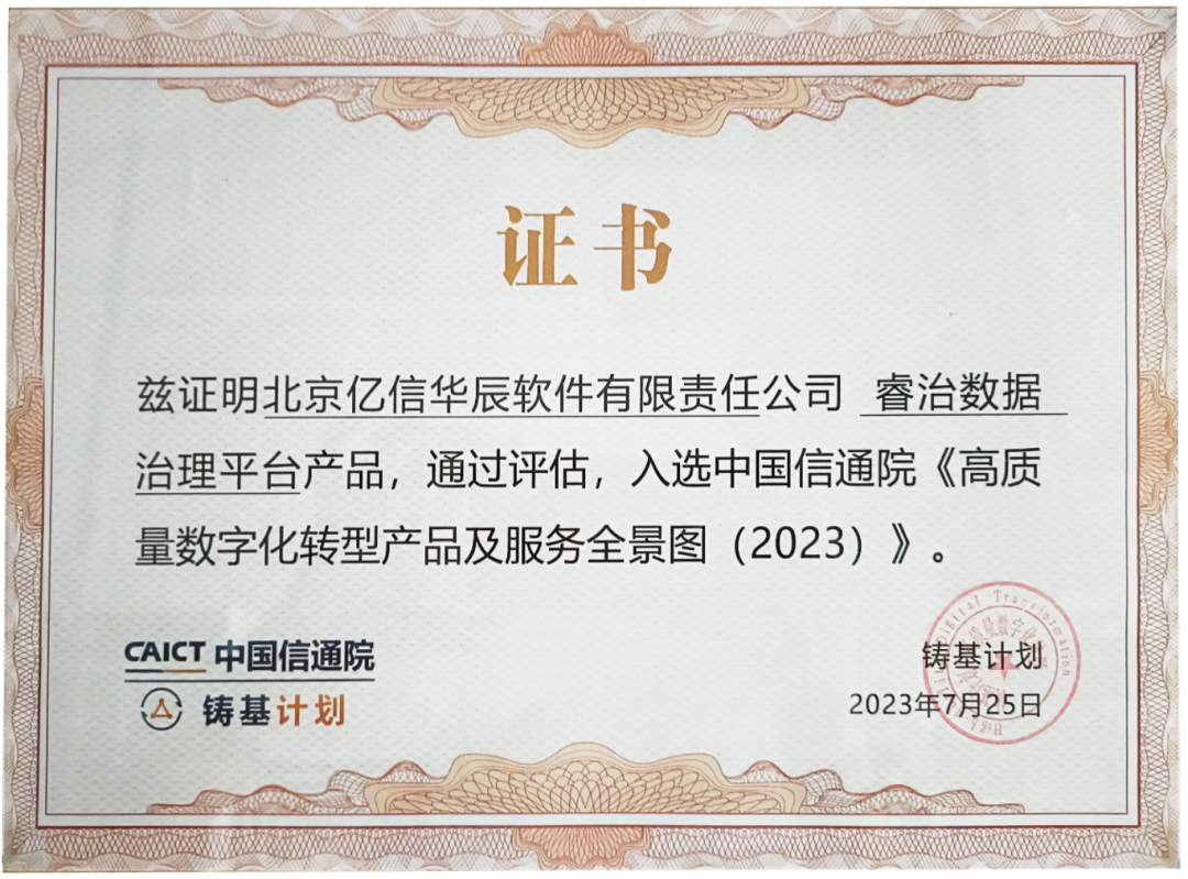 近日,中國信通院在北京召開“2023數字生態發展大會”暨中國信通院“鑄基計劃”年中會議,大會發布了《高質量數字化轉型產品及服務全景圖(2023上半年度)》。億信華辰作為數據治理領域的標桿企業,再次憑借睿治數據治理平臺突出的產品競爭力與豐富的落地實踐成果,在《全景圖》數據治理細分領域榜上有名。