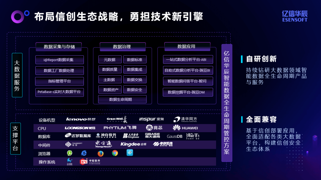 在信創2.0時代,億信華辰積極響應信創政策,堅持國本,布局信創生態戰略,持續自主鉆研專業的大數據平臺工具,從“采、存、管、用”四個方面保障數據全生命周期內的數據安全及數據創新應用。