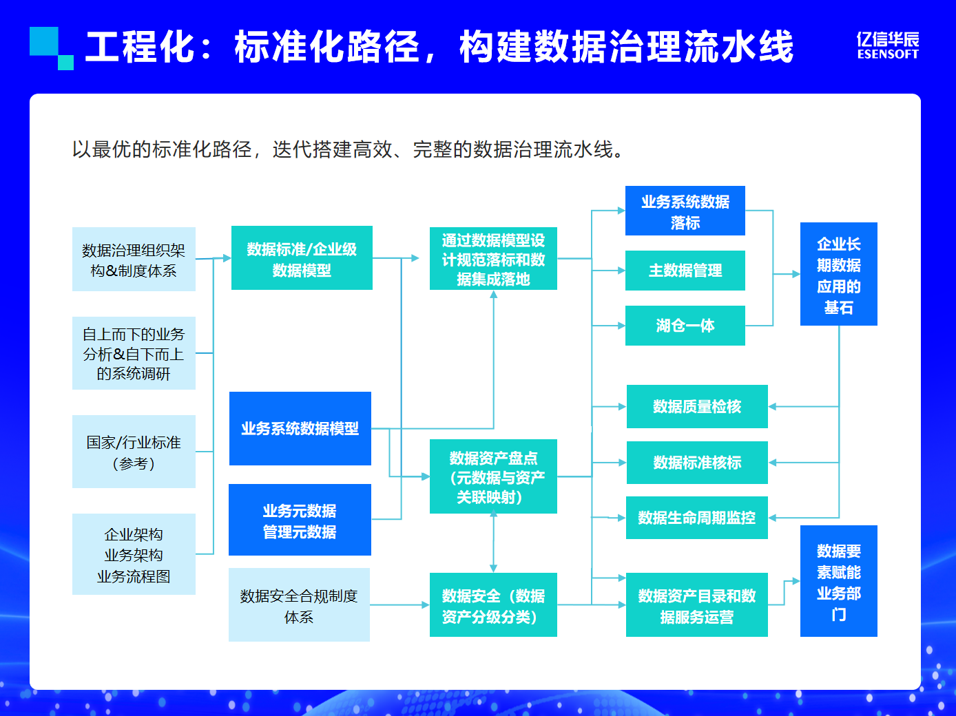 在此背景下,億信華辰作為數據治理領域領航者,為解決政企在數據治理實施過程中遇到的短期VS長期、局部VS全局、效率VS質量等核心矛盾,提出數據治理“三化”理念:場景化、工程化與智能化。其中,場景化是數據治理行業痛點的對癥處方,工程化是數據治理流水線和標準化,智能化是數據治理自動化和去低端人工化。