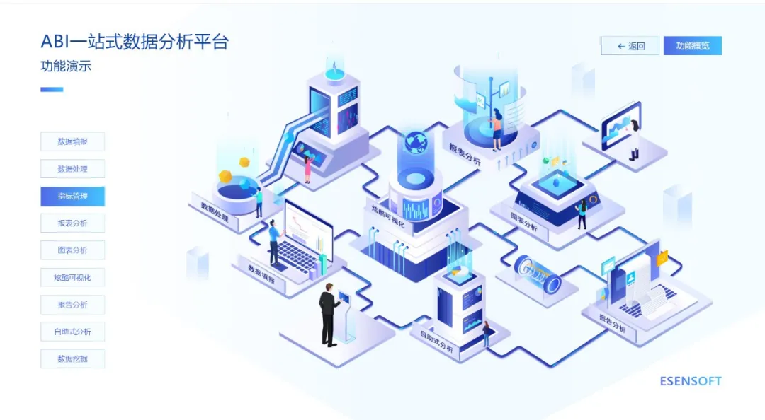億信ABI提供了多種分析手段,在可視化分析方面支持復雜報表、Dashboard、3D可視化、大屏分析、GIS地圖、預測挖掘等,在自助式分析方面支持敏捷看板、即席報告、幻燈片、移動分析等分析方式,以滿足用戶各種分析場景。
