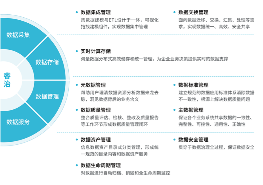 數(shù)據(jù)集成管理、數(shù)據(jù)交換管理、實(shí)時(shí)大數(shù)據(jù)管理、數(shù)據(jù)資產(chǎn)管理、數(shù)據(jù)安全管理、數(shù)據(jù)生命周期管理等十大產(chǎn)品模塊,可獨(dú)立或靈活組合使用,打通數(shù)據(jù)治理各個(gè)環(huán)節(jié),可快速滿足政府、企業(yè)用戶各類不同的數(shù)據(jù)治理場(chǎng)景。