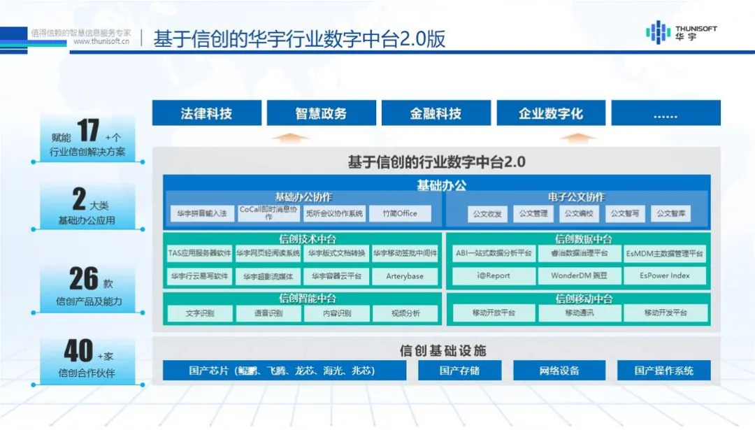 目前,面向法律科技、智慧政務(wù)、金融科技、企業(yè)數(shù)字化等17+個行業(yè)提供信創(chuàng)整體解決方案,涵蓋基礎(chǔ)辦公協(xié)作、電子公文協(xié)作2大基礎(chǔ)辦公應(yīng)用,26款信創(chuàng)產(chǎn)品及能力,40+家信創(chuàng)合作伙伴。未來,在總體框架的基礎(chǔ)上進(jìn)一步整合,融合合作伙伴的能力,打造開放一體的行業(yè)數(shù)字中臺,為行業(yè)信息系統(tǒng)建設(shè)、管理和升級做好賦能。”