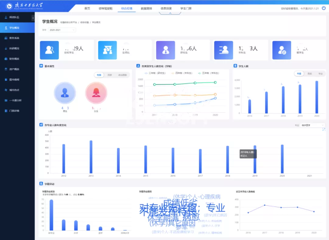 陜西中醫(yī)藥大學利用億信ABI建設了統(tǒng)一的校情綜合分析平臺,涉及內容包括首頁、領導駕駛艙、綜合校情、數(shù)據(jù)簡報、信息探索和學生門禁等各項內容。通過數(shù)據(jù)化運營改進數(shù)據(jù)收集和管理方式,用數(shù)據(jù)驅動業(yè)務,對業(yè)務數(shù)據(jù)進行可視化分析,以提升學校管理水平和服務能力。