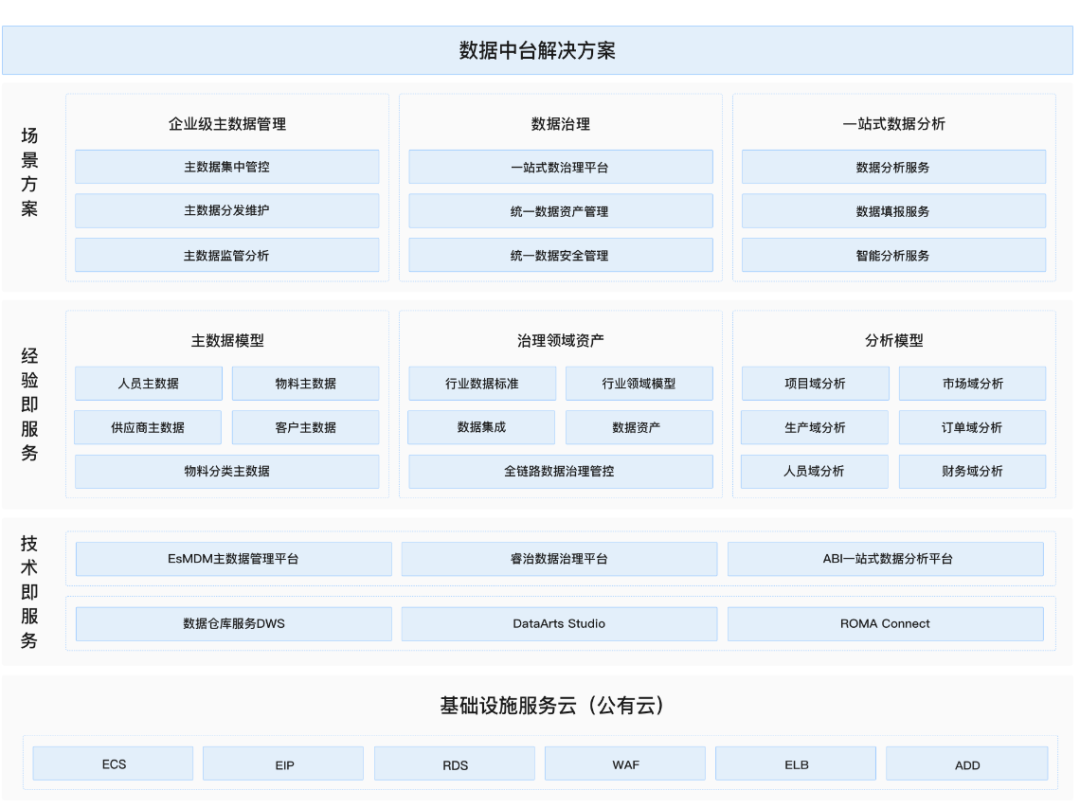 據了解,方案主要由華為云計算底座+DataArts Studio/睿治+數據倉庫DWS+ROMA Connect+主數據管理平臺+一站式數據分析平臺組成的數據中臺解決方案:通過DataArts Studio/睿治開展全鏈路數據治理管控,構建企業級數據資產,全面梳理企業數據情況;通過主數據管理平臺構建主數據模型,開展主數據集中管控,實現主數據全生命周期管理;通過一站式數據分析實現數據綜合分析,全面提升數據應用價值。
