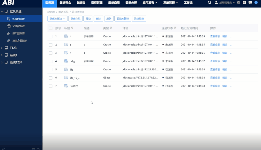 優化之前,連接池是否有效連通需要多步驟操作且無法批量,現在為了讓用戶直觀地看獲取連接池的當前狀態,億信ABI支持用戶對批量選中的連接池進行連通檢測,一鍵就可知曉連接池的連通狀態,便于后期使用。