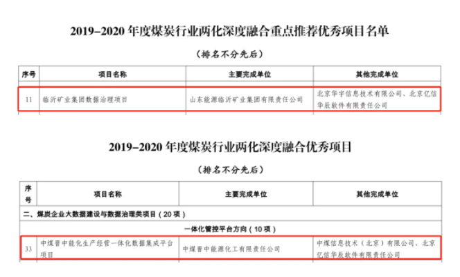 依據《煤炭行業兩化深度融合優秀項目評審辦法》,經會員單位推薦、專家評審、現場調查等程序,億信華辰承建的兩大煤炭數字化項目成功上榜,也是對億信華辰數據治理、