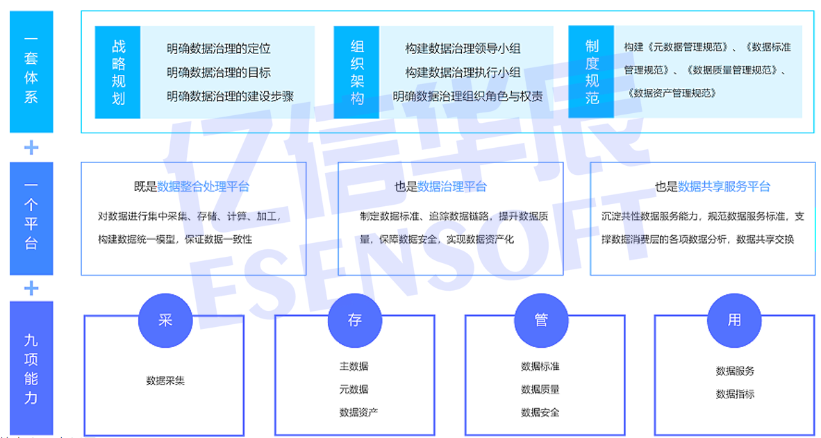 數據治理的核心理念在于“數據取之于業務,用之于業務”,即完整構建車企從數據生產到消費,消費后產生的數據再回流到生產流程的閉環過程。該車企作為國內頭部商用車品牌,年銷量超6萬輛,億信華辰為其打造的“119整體設計”,包括一套體系、一個平臺、九項能力,能夠覆蓋企業整個數據治理乃至數據管理的過程中。基于整體的數據治理方案,需要進行管理體系的建設、平臺能力建設和數據治理實施服務三大方面。