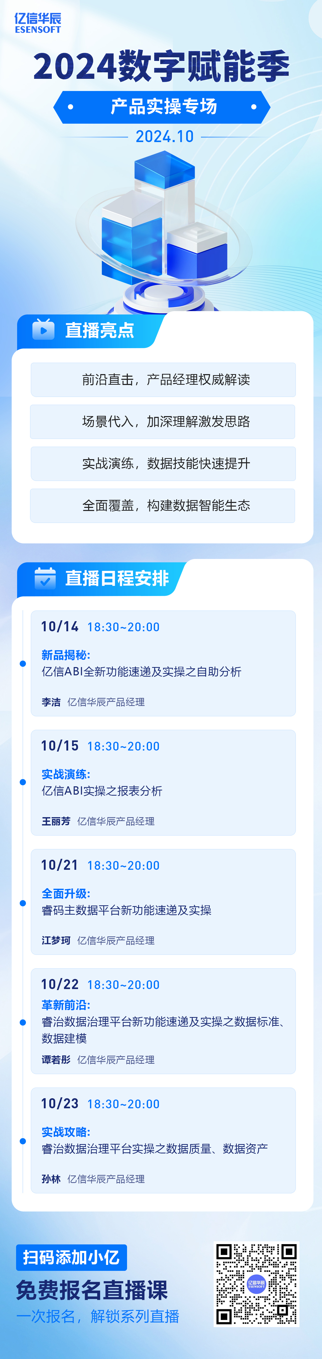 本次直播系列將涵蓋億信華辰旗下多款明星產品的最新功能與實戰應用,從億信ABI的智能化數據分析,到睿碼主數據管理平臺的精準數據整合,再到睿治數據治理平臺的全面數據治理解決方案,我們將為您帶來一場場精彩紛呈的知識盛宴。