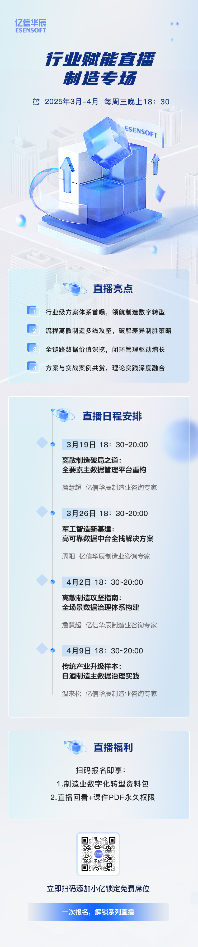 離散制造多線協(xié)同難?流程制造轉(zhuǎn)型慢?數(shù)字化轉(zhuǎn)型浪潮下,制造業(yè)如何破局突圍?答案就在眼前!億信華辰攜手行業(yè)專家,開啟「行業(yè)賦能直播·制造專場(chǎng)」系列直播,3月19日起 每周三晚18:30,直擊制造企業(yè)痛點(diǎn),揭秘離散/軍工/白酒制造領(lǐng)域數(shù)智化通關(guān)密碼!