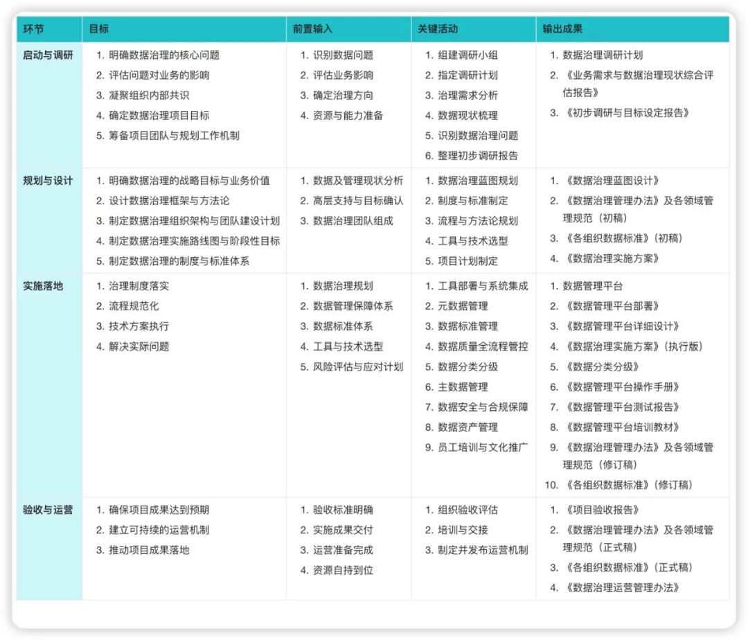 @柴可愛斯基整個數據治理項目的實施,如同其他立項項目一樣,分為啟動調研、規劃設計、實施落地和驗收運營四個關鍵環節。每個環節都需要制定階段性的目標,整理輸入物,以及經由這一階段的關鍵活動,形成對應輸出物。總體而言,一切活動需要遵循系統化、漸進式的方法,以《數據管理能力成熟度評估模型》和DAMA方法論作為指導。