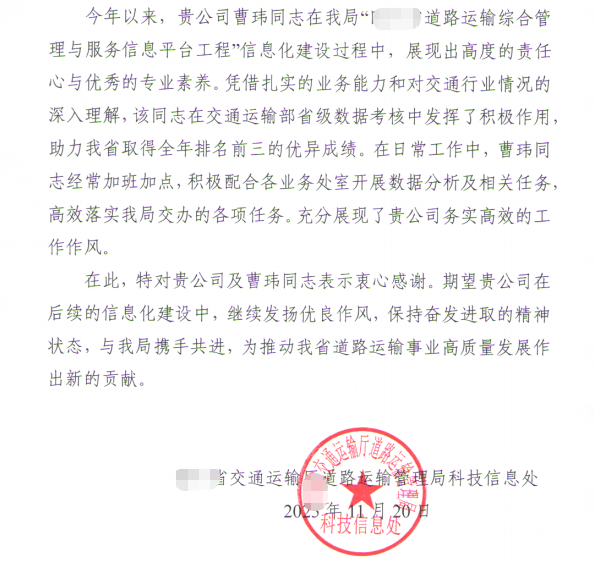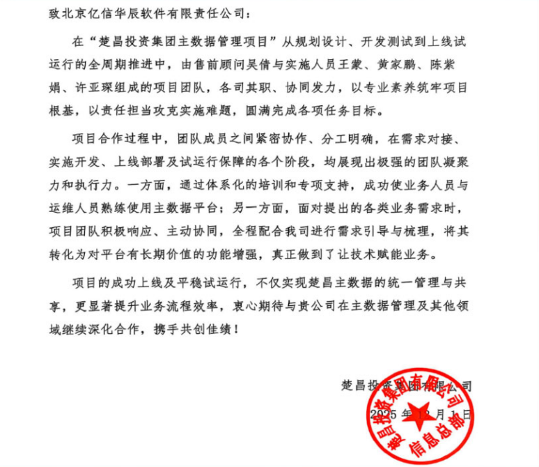 每一封表揚信,都是客戶與我們并肩成長的見證。我們珍視這份認可,并將其轉化為不斷提升產品與服務體驗的動力。未來,億信華辰將繼續專注于通過數據技術幫助更多組織實現數據驅動下的智能決策與業務創新。