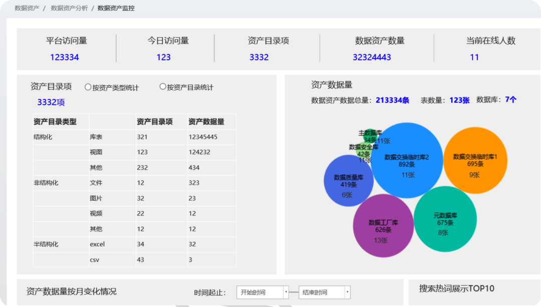平臺(tái)提供多種維度的資產(chǎn)監(jiān)控,并以直觀的圖表展現(xiàn),便于一目了然把控?cái)?shù)據(jù)資產(chǎn)情況。系統(tǒng)按照資產(chǎn)類型、資產(chǎn)目錄對(duì)資產(chǎn)個(gè)數(shù)、資產(chǎn)數(shù)據(jù)量進(jìn)行統(tǒng)計(jì),也提供根據(jù) 不同的數(shù)據(jù)庫(kù)統(tǒng)計(jì)資產(chǎn)數(shù)據(jù)量,按月統(tǒng)計(jì)資產(chǎn)的變化量等統(tǒng)計(jì)維度。