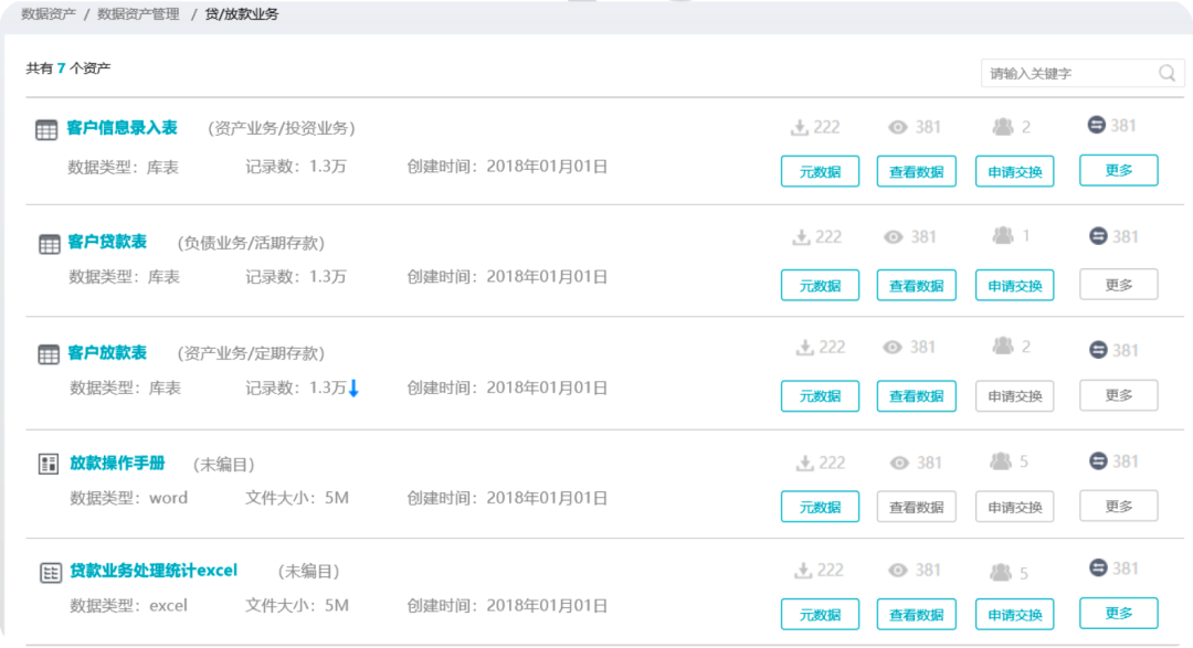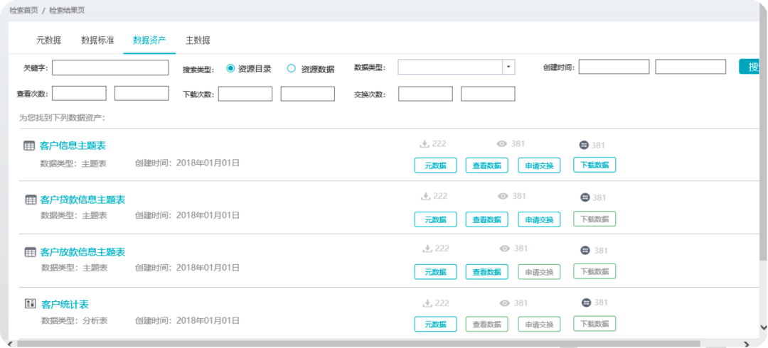檢索條件包括:關(guān)鍵字、搜索類型、查看次數(shù)、下載次數(shù)、交換次數(shù)、創(chuàng)建時(shí)間等豐富的檢索條件,從而實(shí)現(xiàn)數(shù)據(jù)資產(chǎn)快速查找定位。