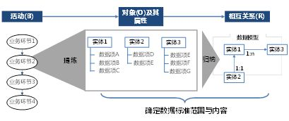 因此,簡(jiǎn)單的說(shuō),BOR方法就是指,依據(jù)所要構(gòu)建的數(shù)據(jù)標(biāo)準(zhǔn)覆蓋的行為/活動(dòng),梳理這些活動(dòng)中涉及到的全部Objects(主體、對(duì)象),以及Objects之間的關(guān)系,構(gòu)建數(shù)據(jù)標(biāo)準(zhǔn)的過(guò)程,就是定義Objects和Behavior的組成要素(也叫信息項(xiàng)),并通過(guò)數(shù)據(jù)模型刻畫Objects之間的一對(duì)一、一對(duì)多和多對(duì)多關(guān)系的過(guò)程。
