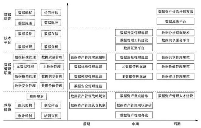 在面向價值實現(xiàn)的數(shù)據(jù)資產(chǎn)管理體系的基礎(chǔ)上,企業(yè)開展數(shù)據(jù)資產(chǎn)管理通常分為前期、中期和后期3個階段,各階段在保障措施、數(shù)據(jù)管理職能、技術(shù)平臺和數(shù)據(jù)運營方面的側(cè)重點和產(chǎn)出物有所不同,以確保企業(yè)統(tǒng)籌規(guī)劃數(shù)據(jù)資產(chǎn)管理,有序推進數(shù)據(jù)資產(chǎn)管理工作,逐步釋放數(shù)據(jù)資產(chǎn)價值。