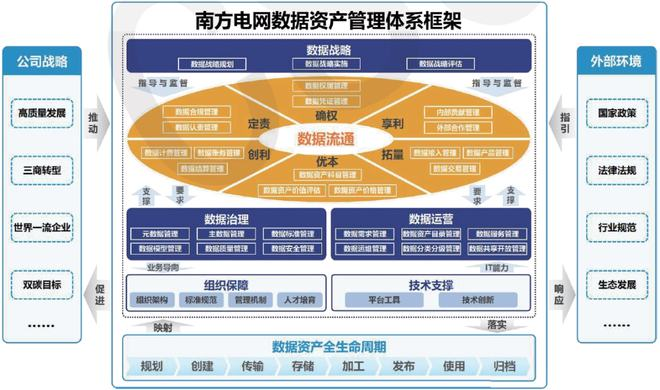 該白皮書提出的數(shù)據(jù)資產(chǎn)管理體系是以國家政策、法律法規(guī)、行業(yè)規(guī)范、生態(tài)發(fā)展等外部環(huán)境為指引,主要由數(shù)據(jù)戰(zhàn)略、數(shù)據(jù)治理、數(shù)據(jù)運營、數(shù)據(jù)流通、組織保障、技術(shù)支撐六個模塊共36項管理職能及數(shù)據(jù)資產(chǎn)全生命周期 8 個環(huán)節(jié)構(gòu)成,通過清晰界定各項職能活動的定位和內(nèi)在聯(lián)系,相對完整地覆蓋了南方電網(wǎng)公司數(shù)據(jù)資產(chǎn)管理的工作領(lǐng)域。