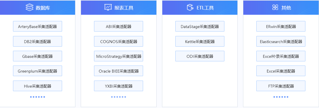 平臺內置豐富的適配器,全面保障各類源頭的元數據自動化采集,一鍵采集對接,同時可支持適配器快速擴展。億信華辰元數據管理平臺不僅適配各種數據庫、各類ETL、各類