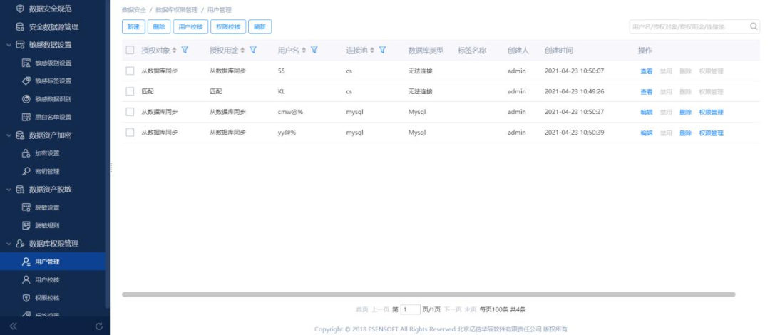 除此之外,睿治提供系統(tǒng)用戶(hù)權(quán)限審計(jì)功能和數(shù)據(jù)庫(kù)權(quán)限管理功能:比如,用戶(hù)權(quán)限審核把關(guān)平臺(tái)用戶(hù)的權(quán)限,新加用戶(hù)及權(quán)限必須通過(guò)審計(jì)后方可生效;另外,數(shù)據(jù)庫(kù)權(quán)限管理可以統(tǒng)一管理數(shù)據(jù)庫(kù)權(quán)限,數(shù)據(jù)庫(kù)用戶(hù)新建、數(shù)據(jù)庫(kù)權(quán)限分配,統(tǒng)一在平臺(tái)上操作。為防止用戶(hù)私下在數(shù)據(jù)庫(kù)中新增改用戶(hù)和權(quán)限,睿治提供數(shù)據(jù)庫(kù)權(quán)限校核功能,檢查平臺(tái)上數(shù)據(jù)庫(kù)用戶(hù)和權(quán)限與實(shí)際數(shù)據(jù)庫(kù)用戶(hù)和權(quán)限不一致的情況。