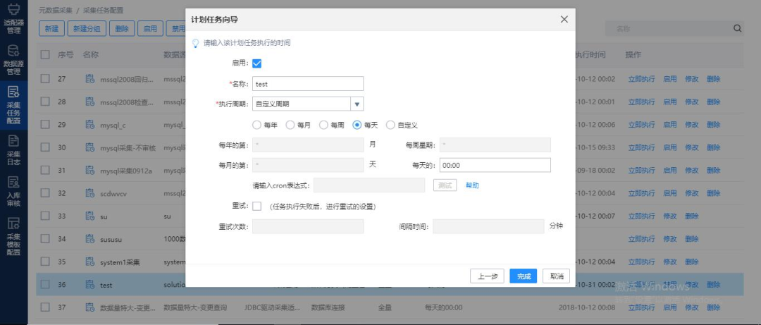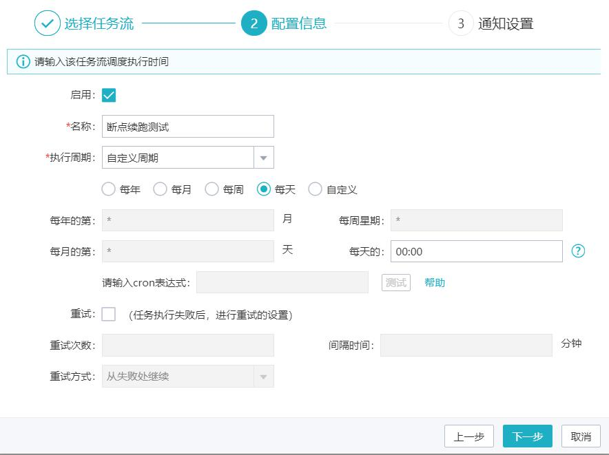 調(diào)度設(shè)置主要用于配置作業(yè)的計(jì)劃執(zhí)行時(shí)間。調(diào)度設(shè)置支持cron表達(dá)式,調(diào)度設(shè)置能指定到月份、日期、小時(shí)、分鐘的粒度,也支持按照星期的方式來(lái)進(jìn)行計(jì)劃任務(wù)的執(zhí)行。同時(shí)能設(shè)置調(diào)度的時(shí)間窗口,重調(diào)時(shí)間間隔。作業(yè)只有在配置的調(diào)度時(shí)間達(dá)到后才會(huì)出發(fā)執(zhí)行的執(zhí)行,在規(guī)定開(kāi)始時(shí)間沒(méi)能啟動(dòng)作業(yè)執(zhí)行時(shí),會(huì)根據(jù)配置的重調(diào)時(shí)間間隔和重調(diào)次數(shù)來(lái)進(jìn)行作業(yè)的重新啟動(dòng),在操作時(shí)間窗口和重調(diào)次數(shù)時(shí),會(huì)進(jìn)行后續(xù)的作業(yè)運(yùn)行和處理。并且調(diào)度可設(shè)置郵件發(fā)送執(zhí)行情況,當(dāng)ETL流執(zhí)行出錯(cuò)時(shí),相關(guān)人員可收到通知和相關(guān)信息,并根據(jù)信息判斷做出處理。