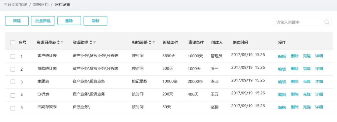 平臺(tái)提供對(duì)數(shù)據(jù)資產(chǎn)進(jìn)行歸檔設(shè)置功能,可根據(jù)數(shù)據(jù)的產(chǎn)生時(shí)間、數(shù)據(jù)量設(shè)置對(duì)應(yīng)的歸檔策略進(jìn)行數(shù)據(jù)近線或離線歸檔,同時(shí)支持批量歸檔,從而保證業(yè)務(wù)系統(tǒng)數(shù)據(jù)的簡(jiǎn)潔。同時(shí),近線區(qū)和離線區(qū)支持用戶(hù)自定義。