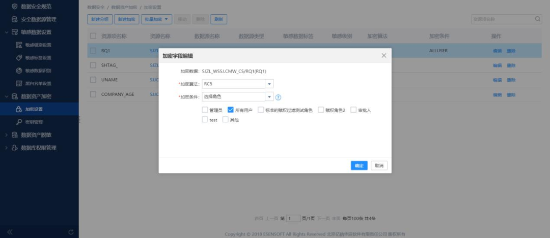 睿治支持對(duì)平臺(tái)自身數(shù)據(jù)資產(chǎn)進(jìn)行加密,目前提供:AES-128、AES-192、AES-256、DES、3DES、RC4、RC5等多種加密方法,同時(shí)支持對(duì)密鑰進(jìn)行管理,保證了加密的多樣性和完整性。