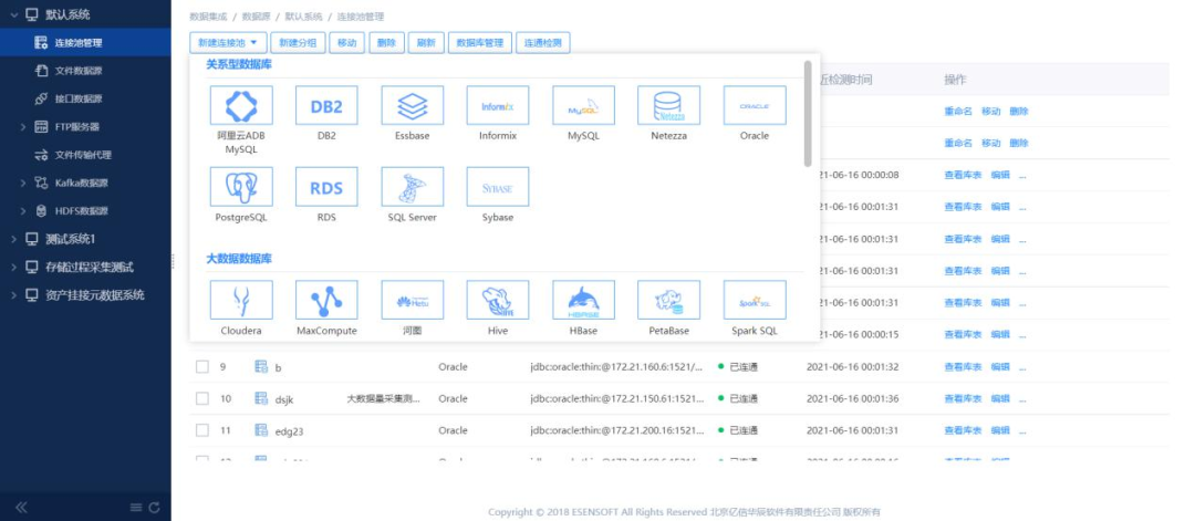 平臺(tái)提供了豐富的數(shù)據(jù)庫(kù)類(lèi)型接入,包括主流的關(guān)系型數(shù)據(jù)庫(kù)、國(guó)產(chǎn)數(shù)據(jù)庫(kù)以及MPP分布式數(shù)據(jù)庫(kù),能將業(yè)務(wù)系統(tǒng)數(shù)據(jù)對(duì)接到平臺(tái)中,提供后續(xù)數(shù)據(jù)資源采集、盤(pán)點(diǎn)、治理和開(kāi)放,數(shù)據(jù)庫(kù)類(lèi)型包括:Oracel、Mysql、Sql Server、DB2、Sybase、達(dá)夢(mèng)DM、PetaBase、Impala、GreenPlum、Hive、Spark SQL、postgresql、Gauss DB200、Vertica、星環(huán) Transwarp、Informix、易鯨捷 EsgynDB等,同時(shí)也支持通過(guò)接入其他數(shù)據(jù)庫(kù)驅(qū)動(dòng)的方式自定義數(shù)據(jù)庫(kù)。