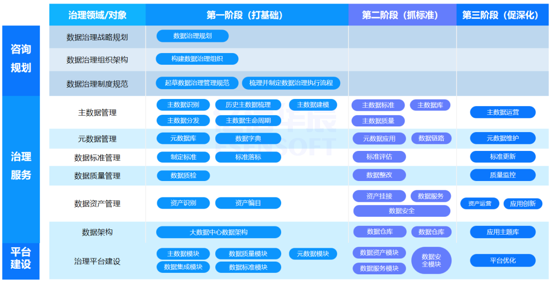 針對數據資產管理體系的規劃應站在企業戰略層面推進,數據資產管理既要大處著眼,更要小處著手,而且要善于找時機切入。比如第一階段重在打基礎,第二階段抓標準,第三階段促深化,循序漸進。一套功能完善、設計合理、可擴展的數據資產管理系統能夠為企業數字化建設帶來諸多收益。