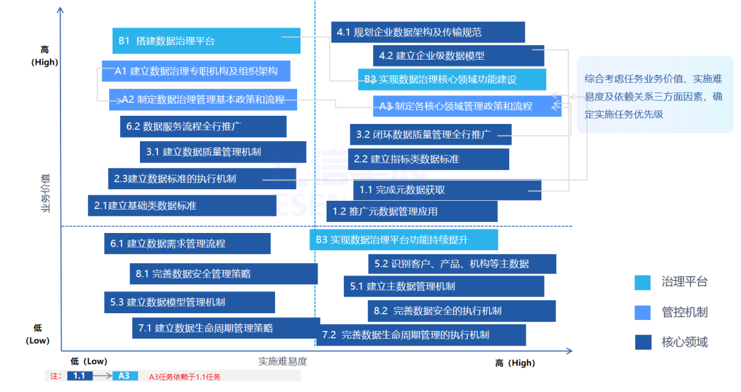 數據資產管理不能一蹴而就,需要建立起長效的持續運營機制,綜合考慮任務業務價值、實施難易度及依賴關系三方面因素,確定實施任務優先級。