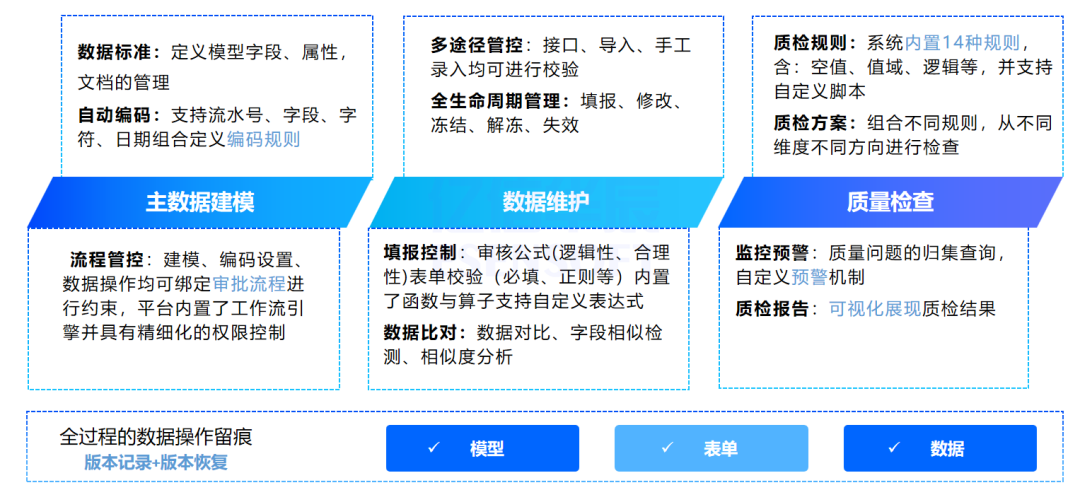 數(shù)據(jù)應(yīng)用效果的基礎(chǔ)。數(shù)據(jù)質(zhì)量管理涉及一系列活動(dòng),包括使用相關(guān)技術(shù)來(lái)衡量、提高和確保數(shù)據(jù)質(zhì)量的規(guī)劃、實(shí)施和控制。數(shù)據(jù)質(zhì)量的指標(biāo)體系包括完整性、規(guī)范性、一致性、準(zhǔn)確性、唯一性、及時(shí)性等。其主要作用是讓數(shù)據(jù)資產(chǎn)清晰如水,確保數(shù)據(jù)真實(shí)有效。