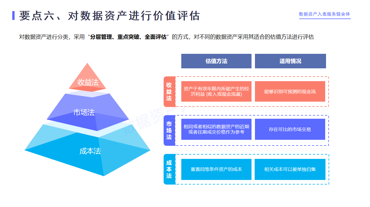 這一次財政部的規定對于數據質產的初始計量只允許以成本計量,但是數據資產定價和估值跟數據資源的入表可以是獨立的。舉例子:數據資產入表可以指入100塊錢,但是估值說它值1萬塊錢,并且可以進行披露 。第二也允許做定價。企業的數據資產放到交易所,交易所現在都有很多的價格引擎會幫你定價,甚至可以自己定價。