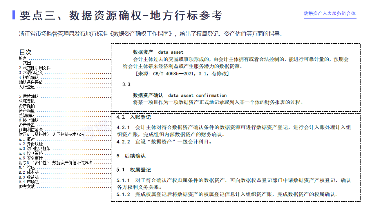 當然可能在各地不一樣,圖上是浙江的數據確權的一個地方指南,每個地方的有關數據資產確權登記的條例都不太一樣,但總體是可以借助交易所幫企業實現數據資產的確權和認定,一旦拿到了數據相關部門頒發的數據產權登記證,就是實現了確權的背書。
