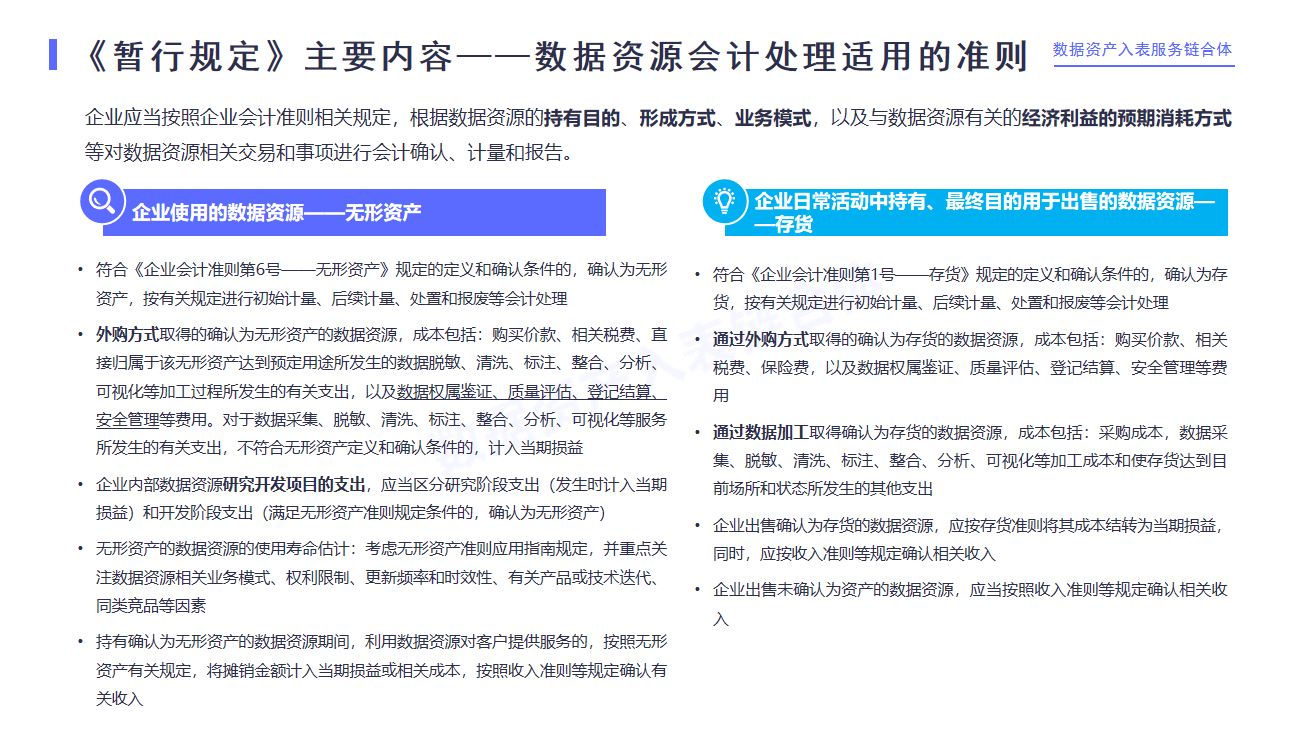 財政部發布的這個暫行規定里,針對可以作為資產入表的兩類是有明確說法的,針對無形資產,明確提出來了外購的無形資產和企業自行研發的數據資產要區別來對待。