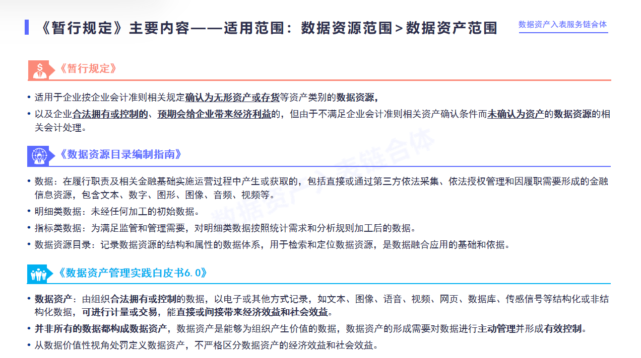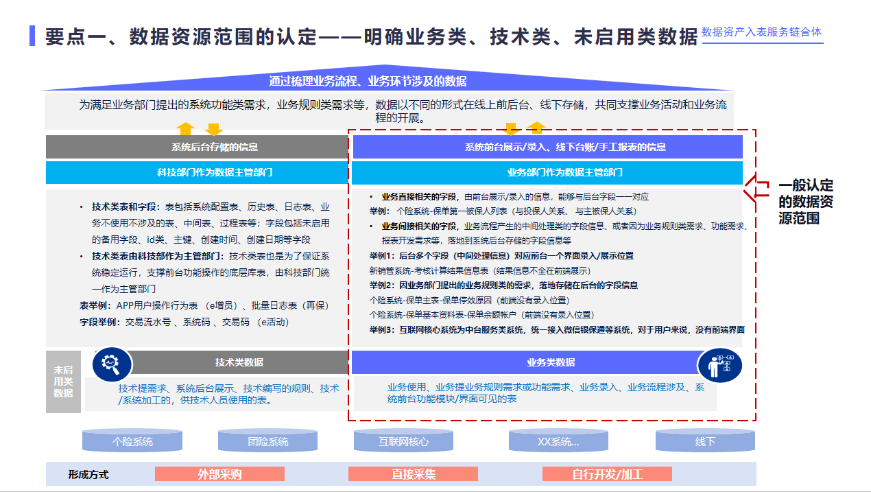 在實操過程中碰到的第一個最大的難題是范圍的認定上,因為范圍太廣。比如說人行有發布一個《數據資源目錄編制指南》,它對數據資源的定義非常之廣泛——“所有業務經營管理過程中產生的電子類的數據,都稱之為數據資源。”