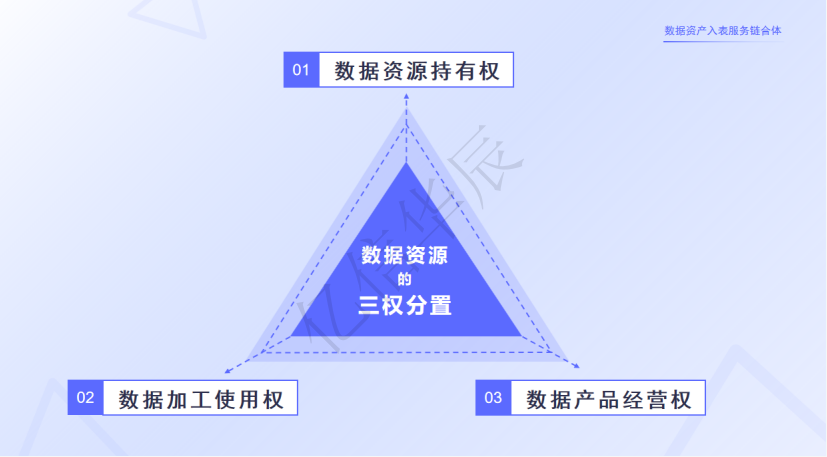 關于數據資源的權屬,有一個三權分置的劃分方式:數據資源的持有權、數據加工使用權和數據產品經營權。如果企業沒有完成數據合規,對于權屬沒有精準確定的話,數據資產后續無論是入表確認還是資產交易,都無法繼續進行。