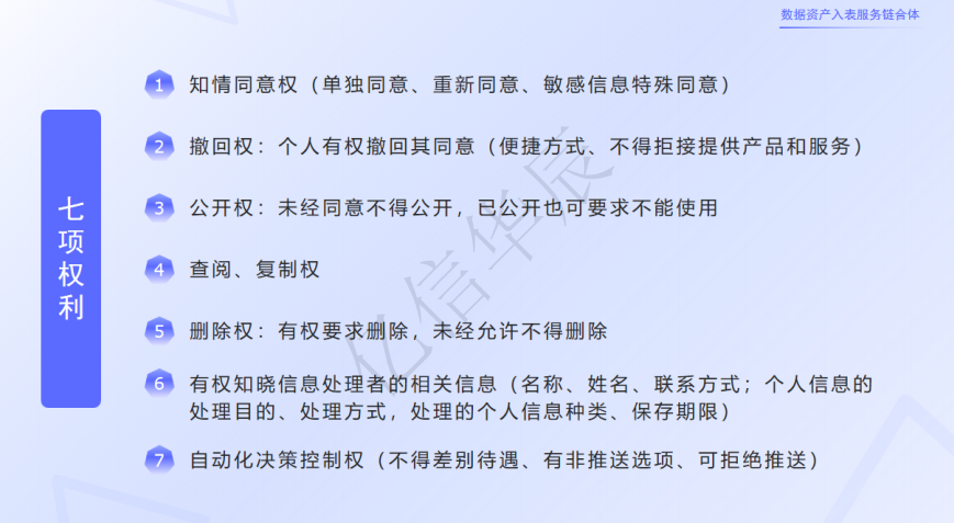 《個人信息保護法》是數據合規的根本。這部法的發條和要義較多,主要梳理了7大核心權利:知情同意權、撤回權、公開權、查閱復制權、刪除權、有權知曉信息處理者的相關信息、自動化決策控制權。知情同意權是如果企業有了相關的數據,但在未經個人同意的情況下,是不太能動這些數據的。還有一個很重要的是撤回權,比如我作為用戶把一部分信息給到了APP、公司或平臺,但我可以隨時撤回,如果我要求撤回授權,那平臺就不能再拿著這個數據進行相應開發。