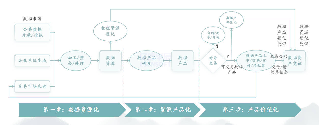 首先是數據資源化階段,企業對公共數據、系統生成數據、市場采購數據進行綜合處理和整合,形成一份經過登記的資源清單,標志著數據進入資源化的階段。