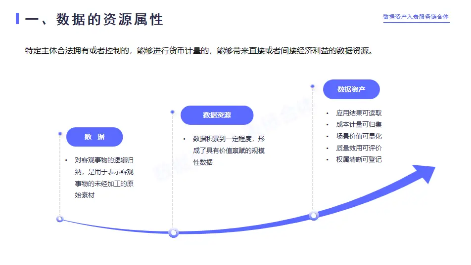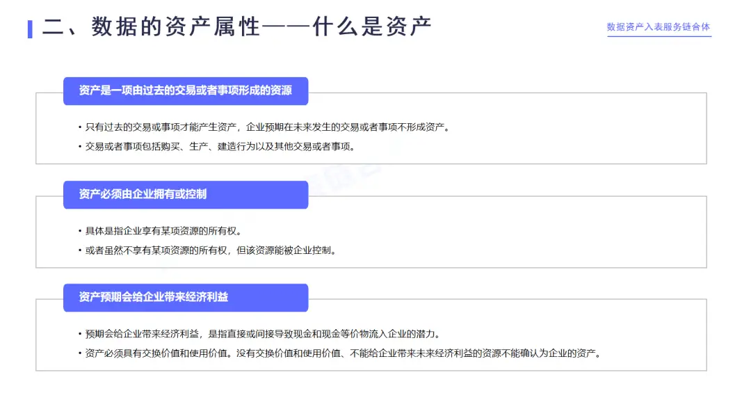 從數據角度,我們分析了數據經過積累形成數據資源,數據資源符合可商業化前提就構成了數據資產。從會計資產的角度,符合三大資產確認前提的數據資源,就能夠成為會計可以計量的,也就是說可以入表的資產。但是還需要把數據資產與其他資產的邊界界定出來,才最終非常準確的知道入表的對象是什么,評估對象是什么。