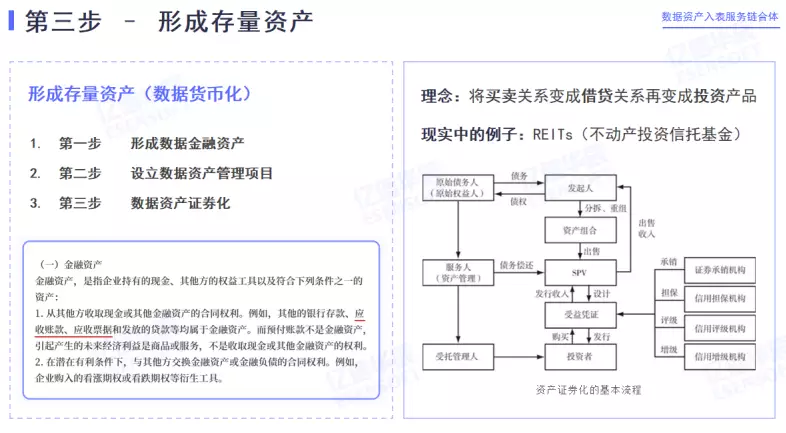 存量資產(chǎn)是指企業(yè)所擁有全部可確指的資產(chǎn),企業(yè)的應(yīng)收賬款、其他應(yīng)收款、無(wú)形資產(chǎn)都屬于企業(yè)的存量資產(chǎn)。這里重點(diǎn)要指出的是應(yīng)收賬款和其他應(yīng)收款,數(shù)據(jù)一旦成為數(shù)據(jù)商品,只要交易量上來(lái),就會(huì)形成數(shù)據(jù)相關(guān)的應(yīng)收賬款,還有存貨相關(guān)的抵押賬款等,這些款項(xiàng)都能形成業(yè)內(nèi)所說(shuō)的金融資產(chǎn)。只有形成了眾多金融資產(chǎn)的情況下,才能構(gòu)建金融資產(chǎn)池,然后才能走到金融化這一步。而金融化往往實(shí)現(xiàn)模式就是證券化。形成存量資產(chǎn)的后續(xù)影響是數(shù)據(jù)的貨幣化。一旦數(shù)據(jù)資產(chǎn)能實(shí)現(xiàn)證券化,從某種意義上數(shù)據(jù)本身就變成了貨幣。